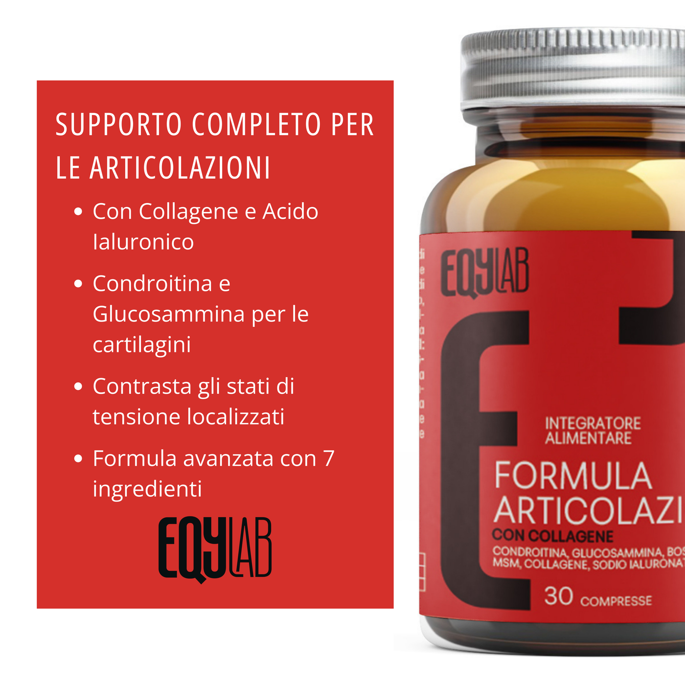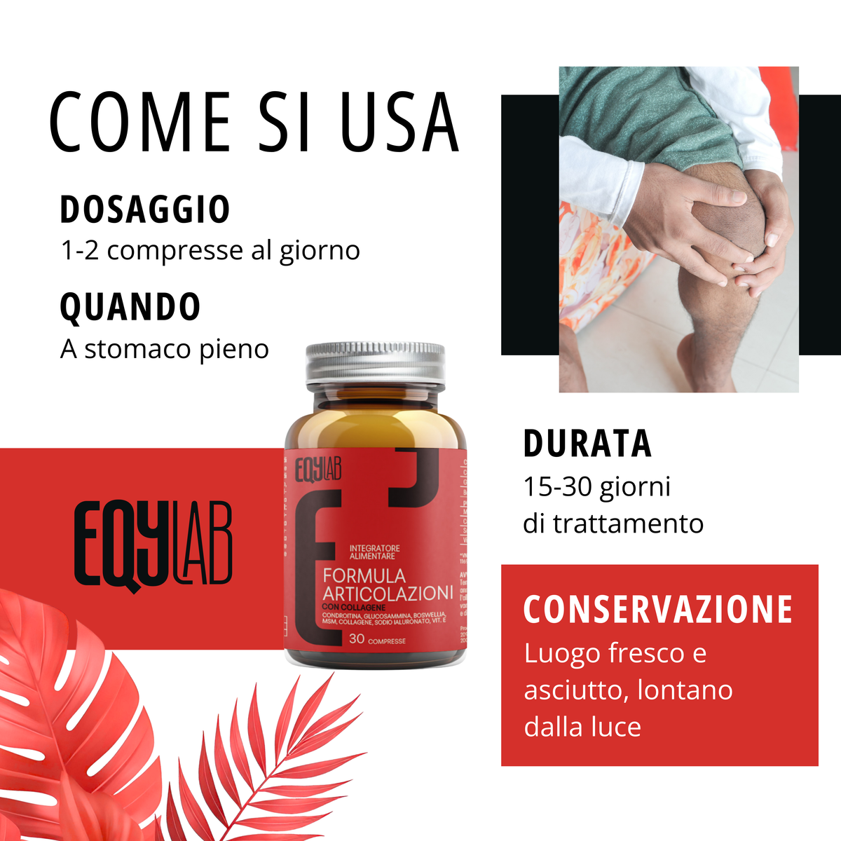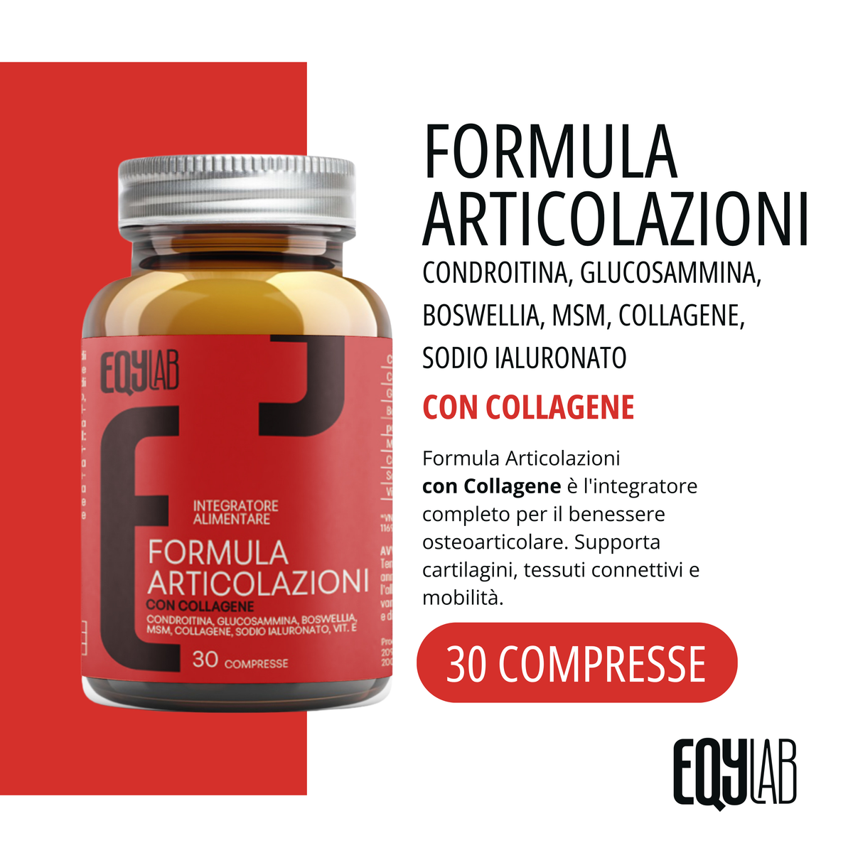 La formula combina condroitina, glucosamina, MSM e collagene idrolizzato, ingredienti comunemente utilizzati per il supporto articolare. La Boswellia aiuta a contrastare stati di tensione localizzati, mentre la Vitamina E contribuisce alla protezione delle cellule dallo stress ossidativo.