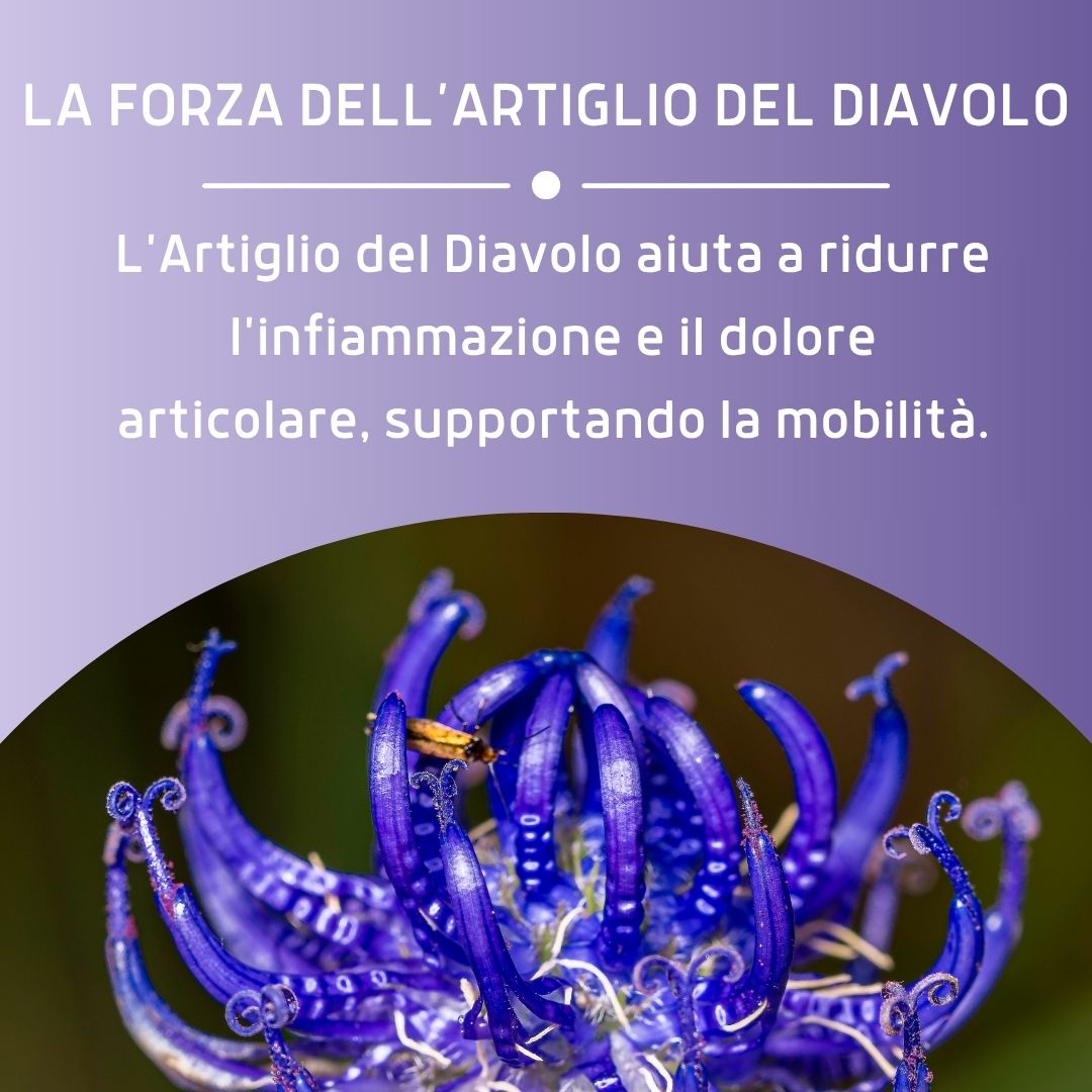 Artiglio del diavolo (Harpagophytum procumbens): pianta africana dalle radici nodose, usata tradizionalmente nella fitoterapia per le sue proprietà antinfiammatorie e analgesiche. Ricca di arpagoside, agisce come supporto naturale contro i disagi articolari e muscolari. Viene utilizzato in caso di artrosi, tendiniti, rigidità mattutina e in fase di recupero muscolare.