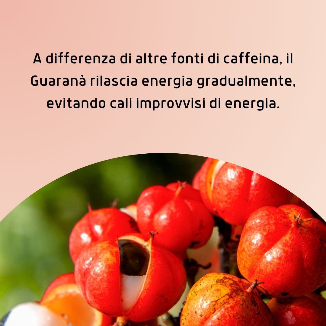 Guaranà (Paullinia cupana Kunt): originario dell’Amazzonia, i semi del guaranà sono noti per l’elevato contenuto di caffeina naturale, associata a tannini e saponine. A differenza della caffeina sintetica, quella del guaranà è rilasciata lentamente, assicurando una stimolazione costante e duratura. Viene tradizionalmente usato come tonico energizzante, antifatica e supporto nella concentrazione. È controindicato nei soggetti sensibili alla caffeina, in gravidanza, allattamento e nei bambini.