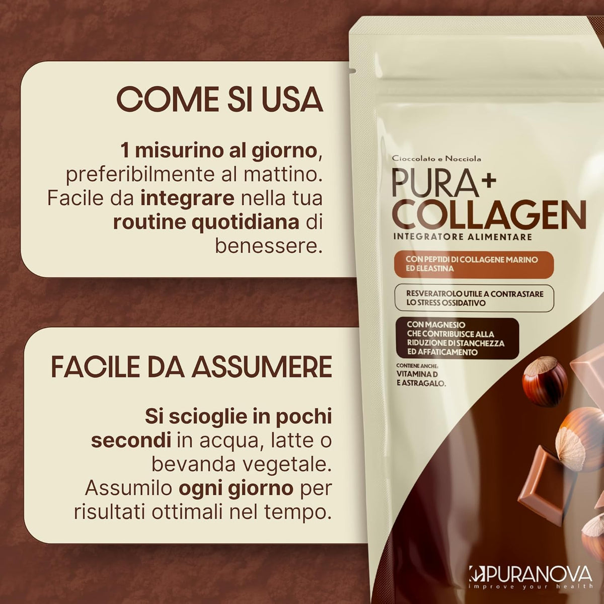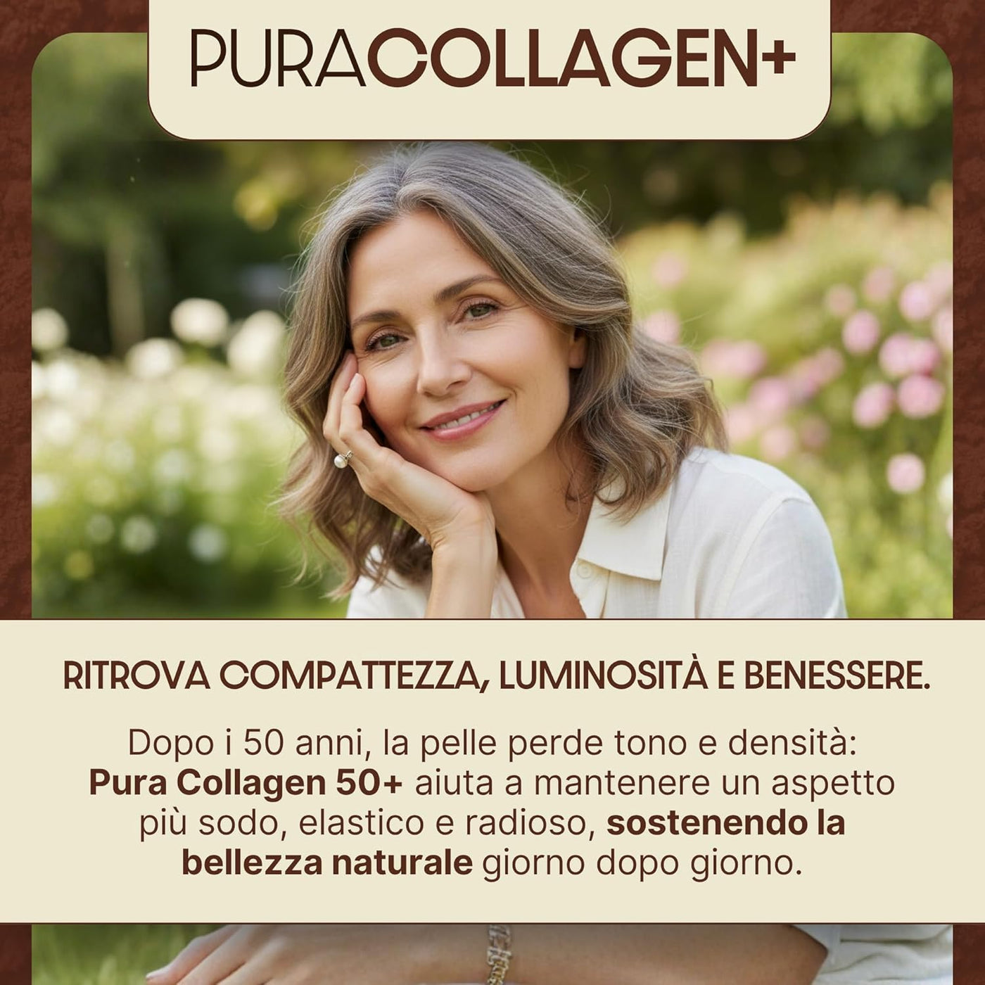 Puracollagen 50+ è indicato per chi ha una pelle matura e desidera supportarne elasticità, compattezza e tono. È pensato per accompagnare la beauty routine quotidiana over 50, quando la pelle tende a perdere progressivamente struttura e vitalità.
