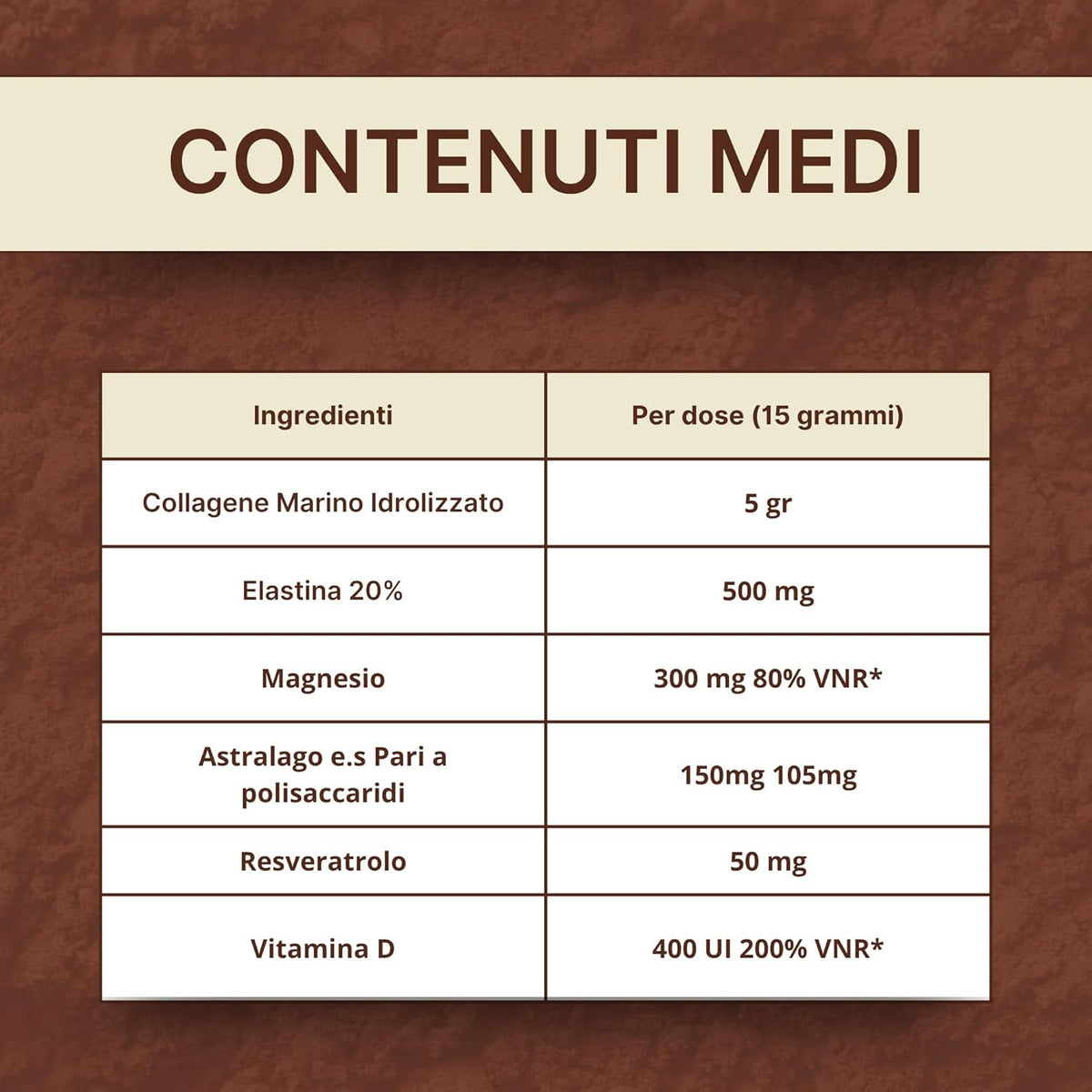 Collagene Marino Idrolizzato, Maltodestrine, Magnesio Idrossido, Elastina, Aroma, Astragalo e.s. (Astragalus membranaceus tit. 70% polisaccaridi, radice), poligono [Polygonum cuspidatum Siebold & Zucc, syn. Fallopia japonica (Houtt.) Ronse Dec] radice estratto secco titolato al 98% di resveratrolo, sucralosio, Vitamina D.